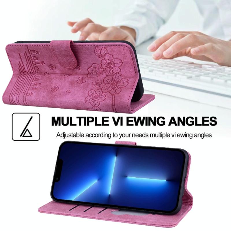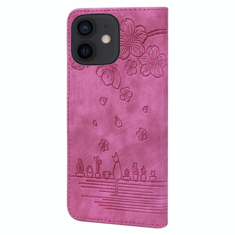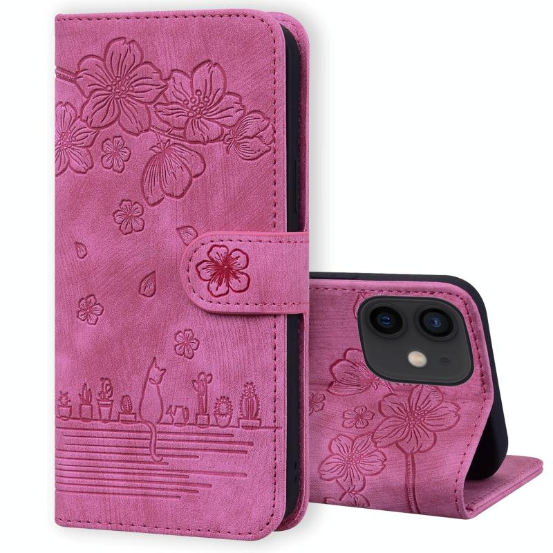 For iPhone 11 Cartoon Sakura Cat Embossed Leather Case (Rose Red)