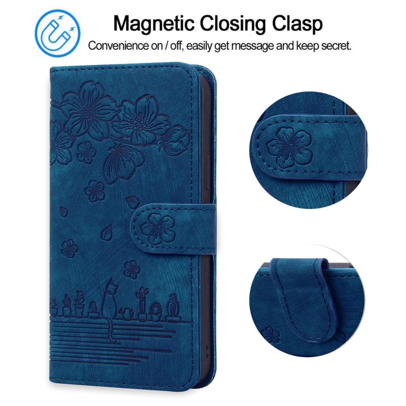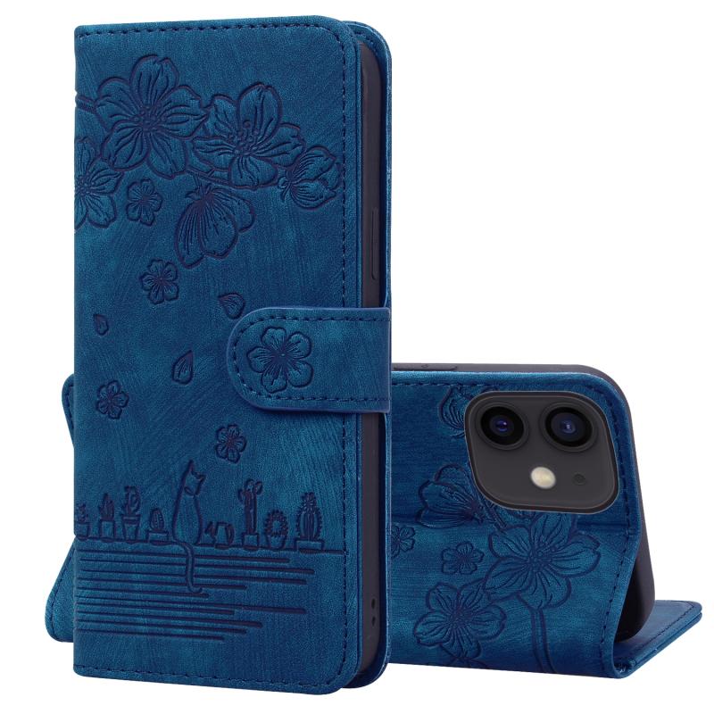 For iPhone 11 Cartoon Sakura Cat Embossed Leather Case (Royal Blue)