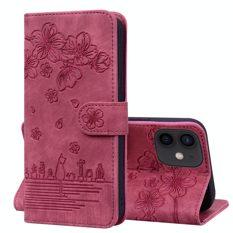 For iPhone 11 Cartoon Sakura Cat Embossed Leather Case (Wine Red)