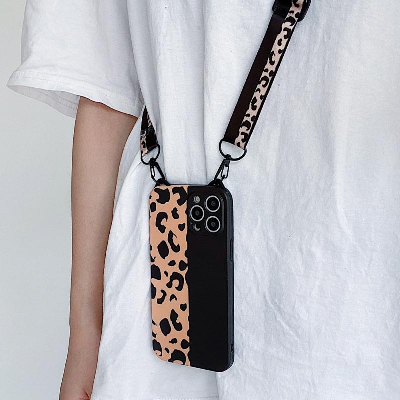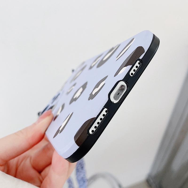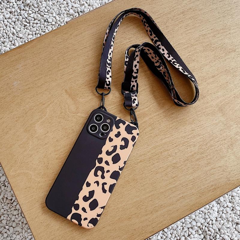 For iPhone 11 Cat Ear Leopard Print TPU Straight Edge Protective Case with Lanyard (Black Color Matching)
