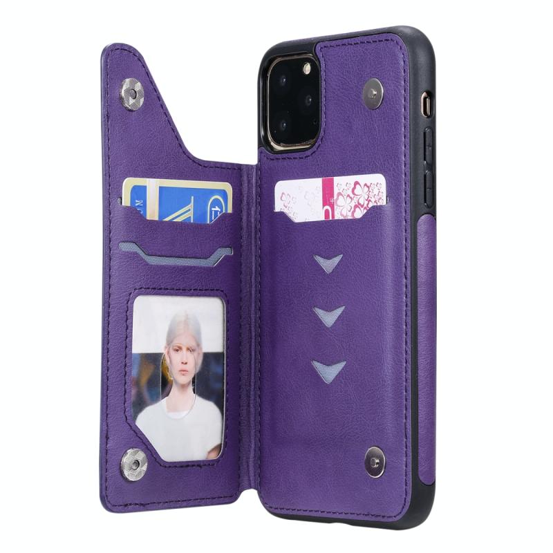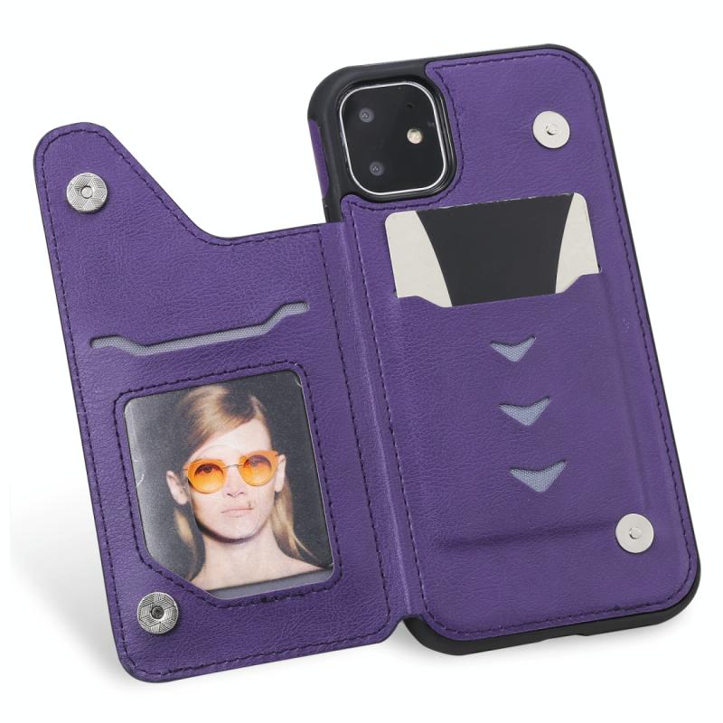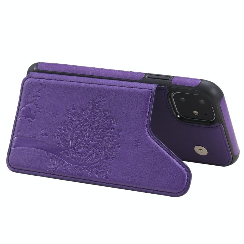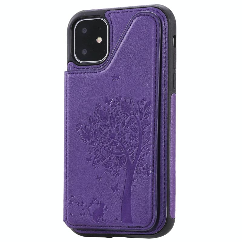 For iPhone 11 Cat Tree Embossing Pattern Shockproof Protective Case with Card Slots & Photo Frame & Holder(Purple)