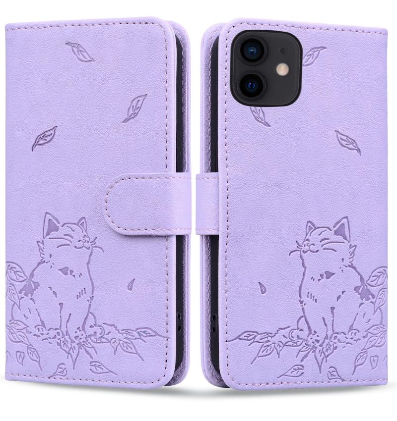 For iPhone 11 Cute Cat Embossed Leather Phone Case(Purple)