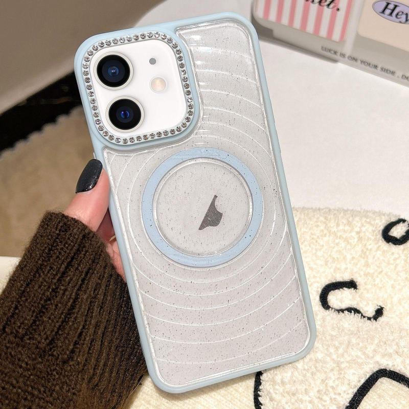 For iPhone 11 Diamond Lens Frame MagSafe Wave Texture Clear Phone Case(Blue)