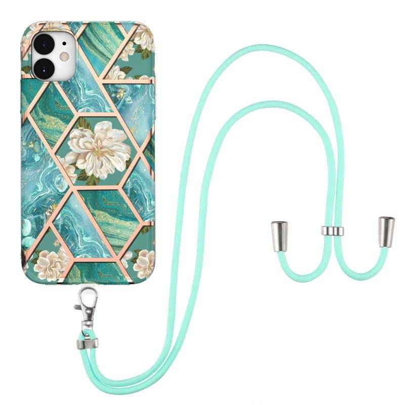 For iPhone 11 Electroplating Splicing Marble Flower Pattern TPU Shockproof Case with Lanyard (Blue Flower)