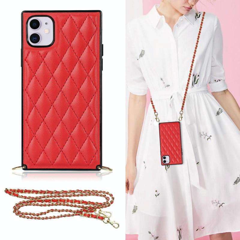 For iPhone 11 Elegant Rhombic Pattern Microfiber Leather +TPU Shockproof Case with Crossbody Strap Chain (Red)