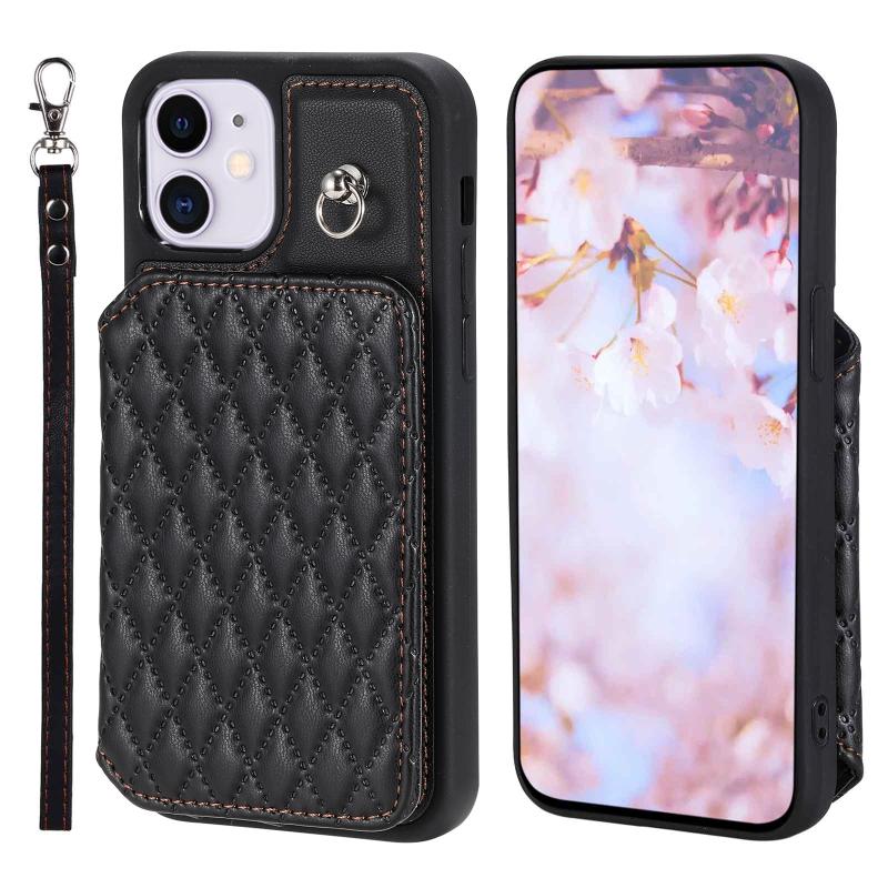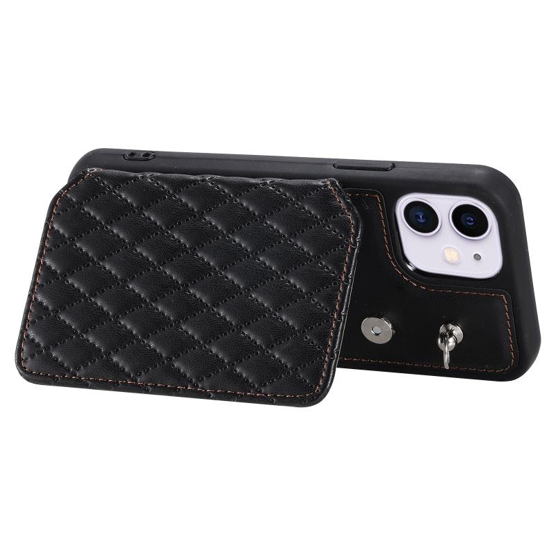 For iPhone 11 Grid Texture Card Bag Phone Case with Lanyard(Black)