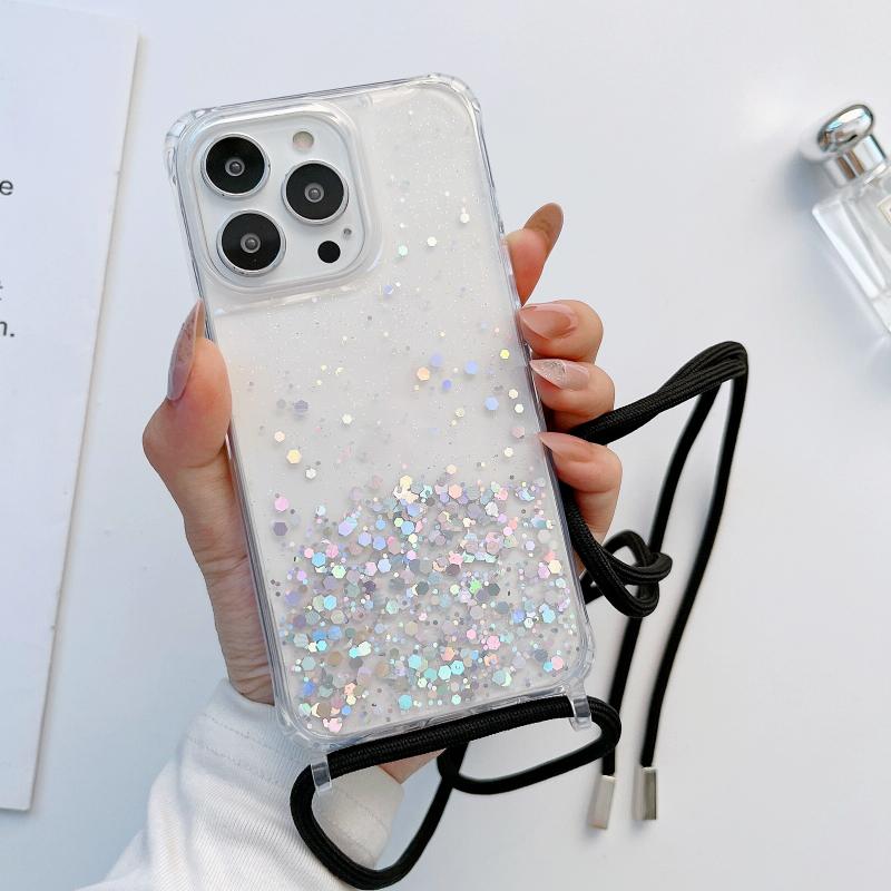 For iPhone 11 Lanyard Glitter Epoxy Clear Phone Case (Black)