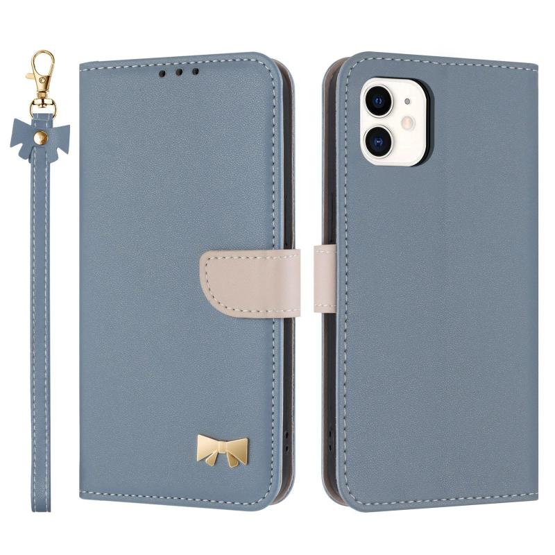 For iPhone 11 Metal Bow Leather Phone Case with Hand Strap(Light Blue)