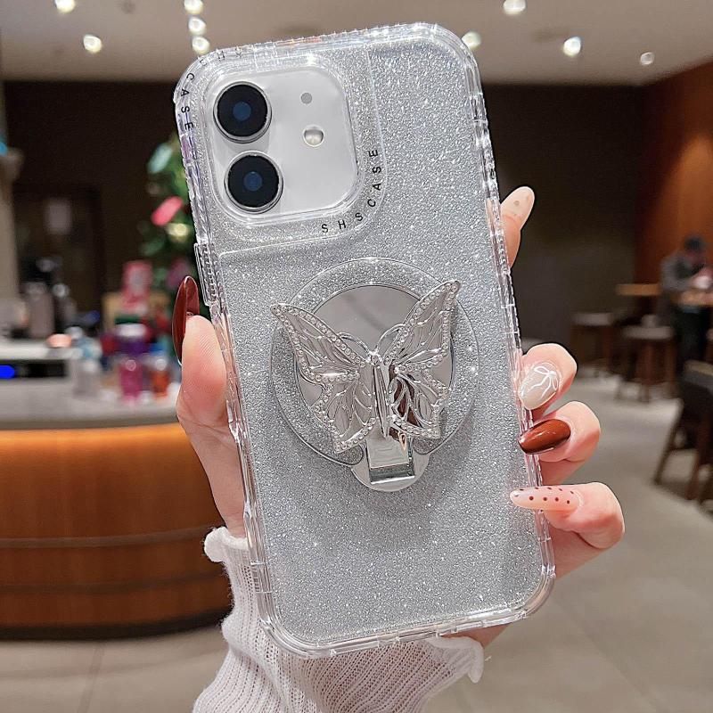 For iPhone 11 Mirror Butterfly Holder Glitterr MagSafe Phone Case(Silver)