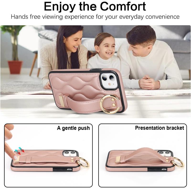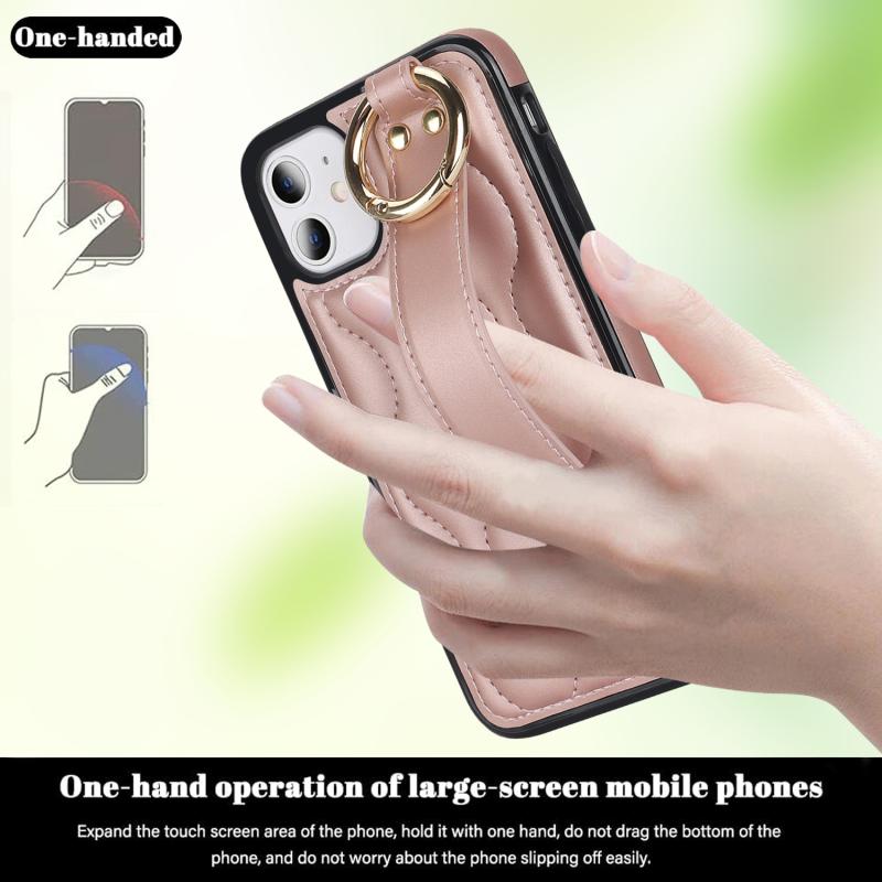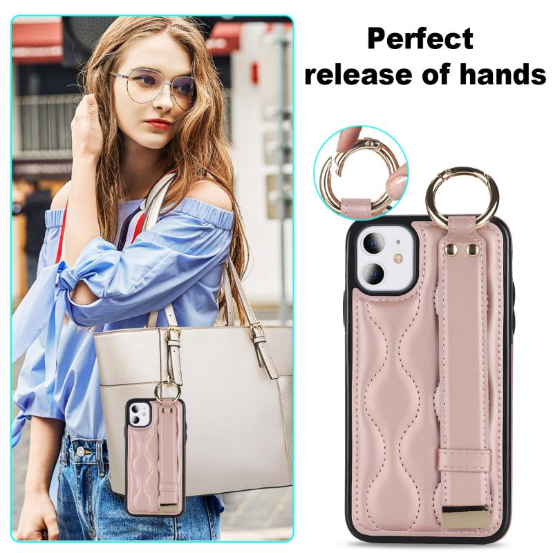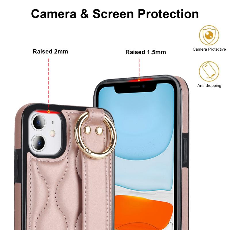 For iPhone 11 Non-slip Full Coverage Ring PU Phone Case with Wristband(Rose Gold)