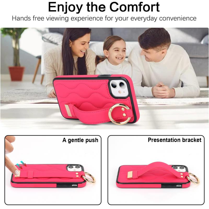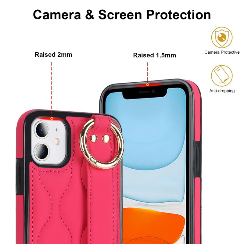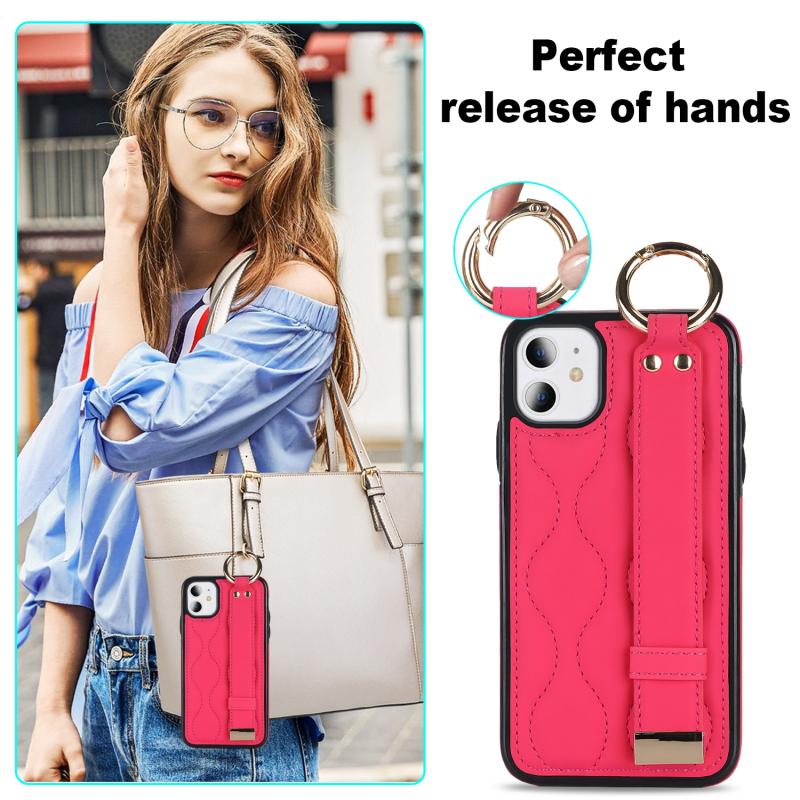 For iPhone 11 Non-slip Full Coverage Ring PU Phone Case with Wristband(Rose Red)