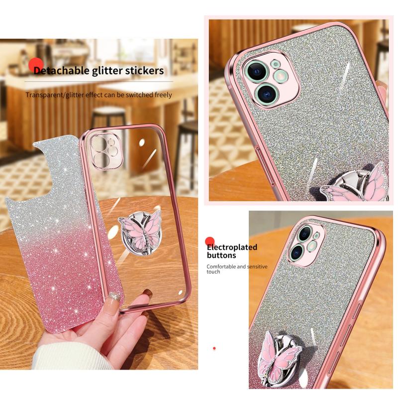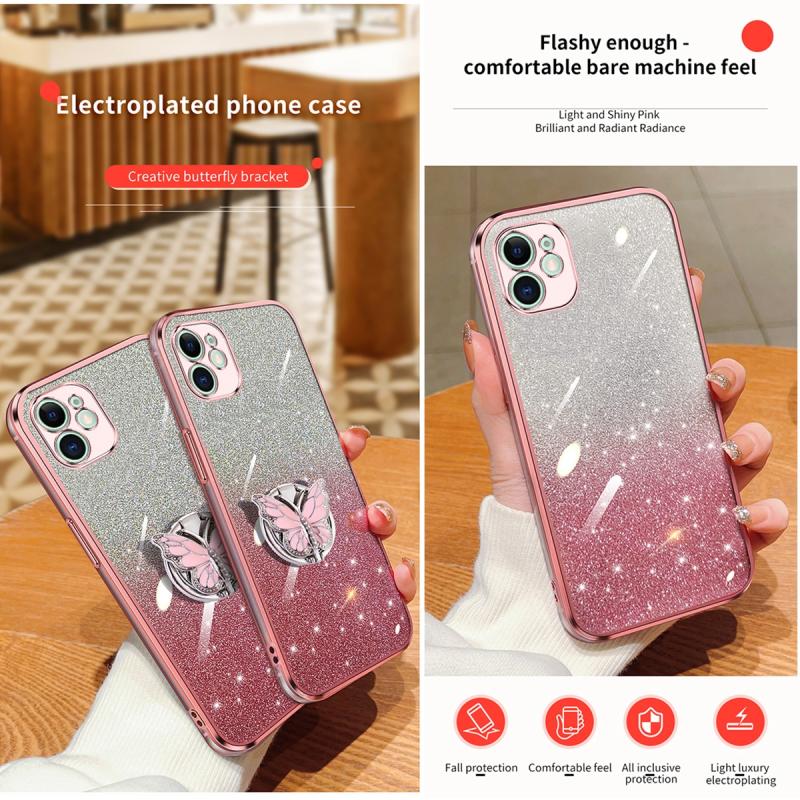 For iPhone 11 Plated Gradient Glitter Butterfly Holder TPU Phone Case(Sierra Blue)
