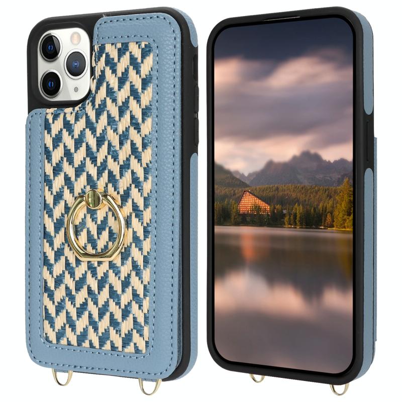 For iPhone 11 Pro Double Bckle Card Slot Full Coverage Phone Case with Cross-body Strap(Blue)