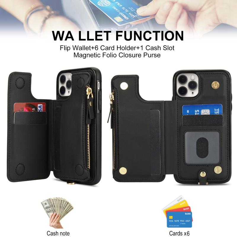 For iPhone 11 Pro Double Flap Zipper RFID Leather Phone Case with Short Lanyard(Black)