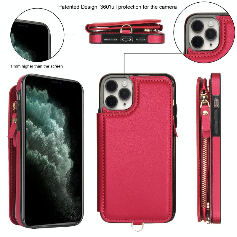 For iPhone 11 Pro Double Flap Zipper RFID Leather Phone Case with Short Lanyard(Red)