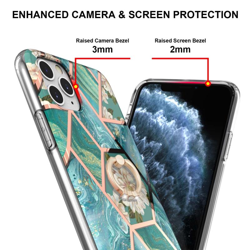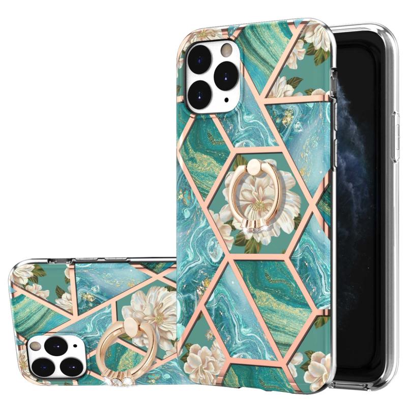 For iPhone 11 Pro Electroplating Splicing Marble Flower Pattern TPU Shockproof Case with Rhinestone Ring Holder (Blue Flower)