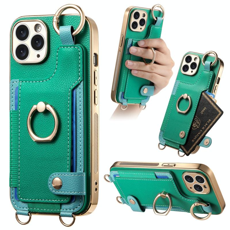 For iPhone 11 Pro Fashion Ring Card Bag Phone Case with Hang Loop(Green)