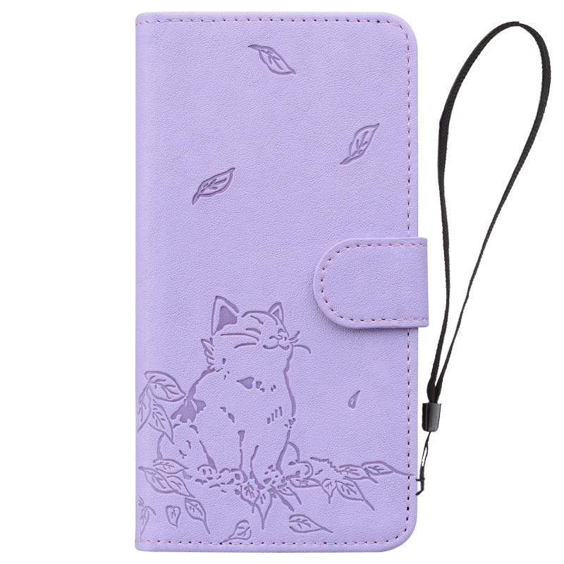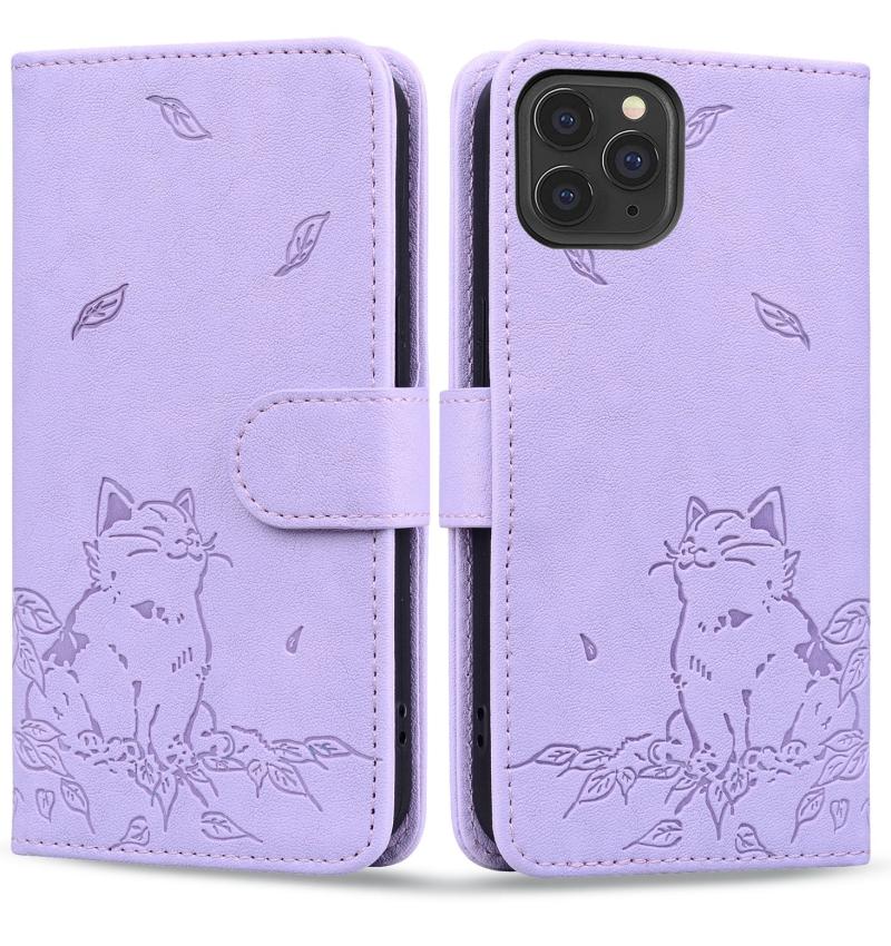 For iPhone 11 Pro Max Cute Cat Embossed Leather Phone Case(Purple)