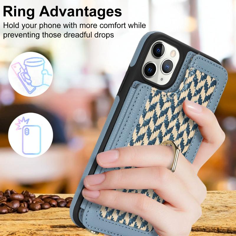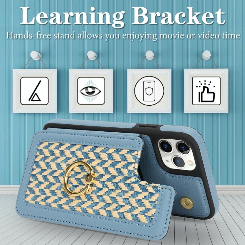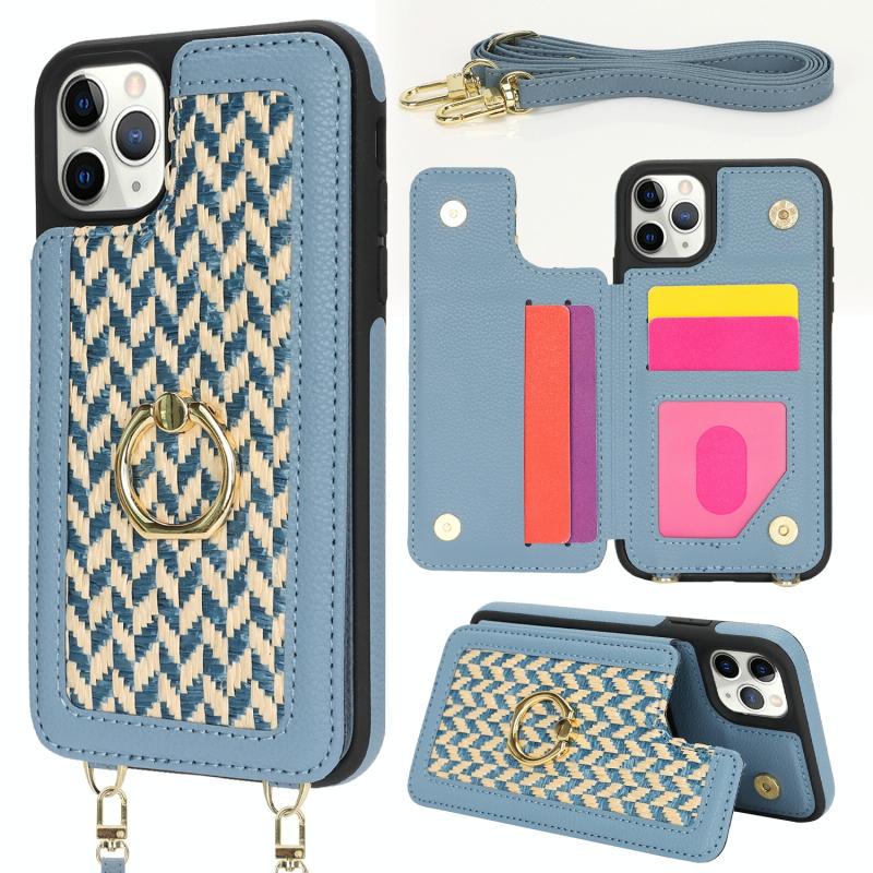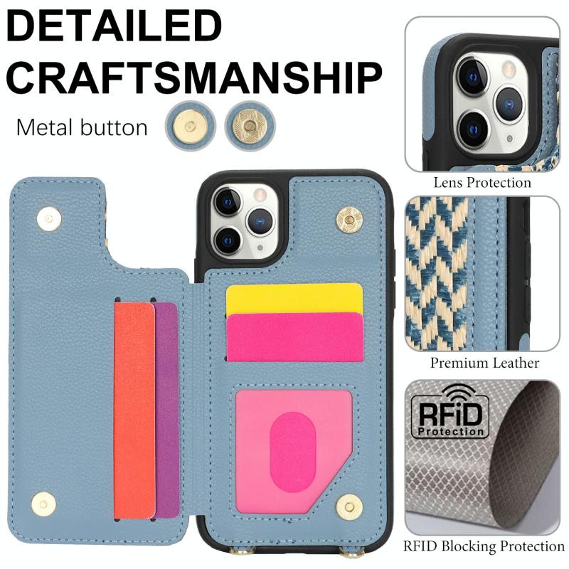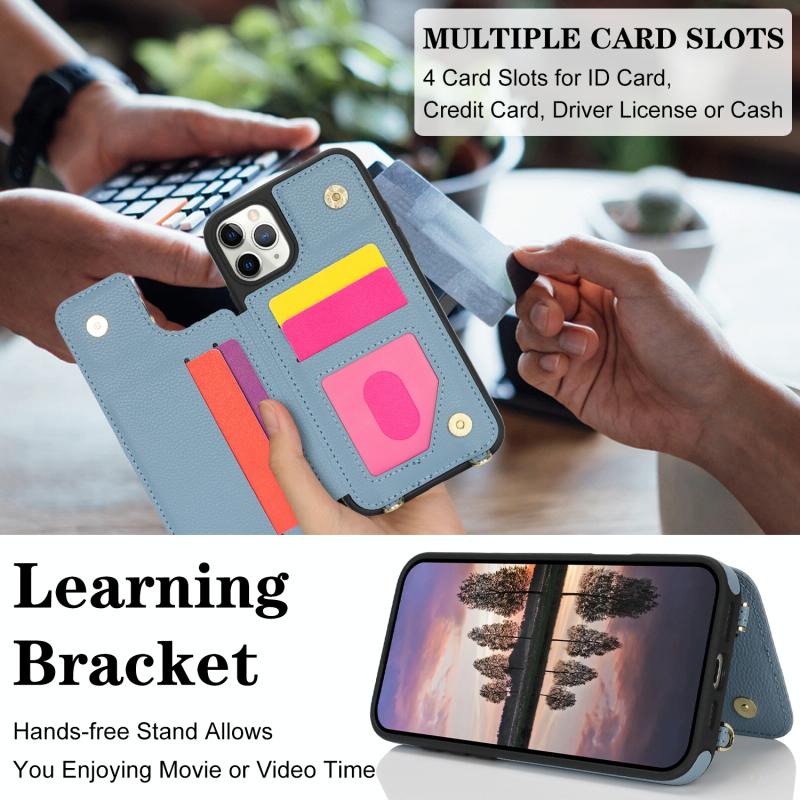 For iPhone 11 Pro Max Double Bckle Card Slot Full Coverage Phone Case with Cross-body Strap(Blue)