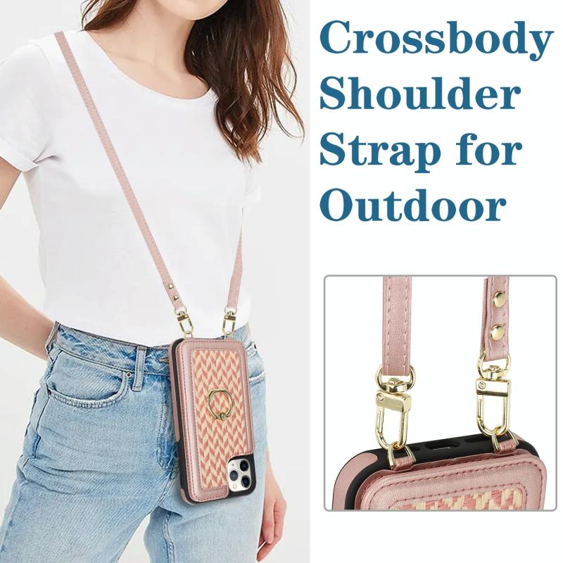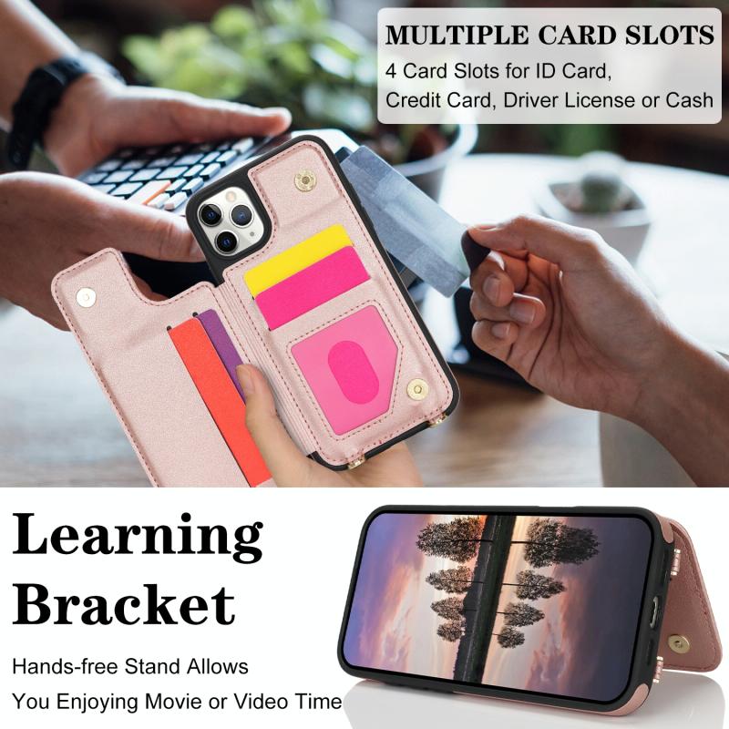 For iPhone 11 Pro Max Double Bckle Card Slot Full Coverage Phone Case with Cross-body Strap(Rose Gold)