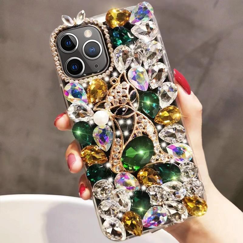 For iPhone 11 Pro Max Handmade Bling Rhinestone Gemstone Fox PC Phone Case(Green)