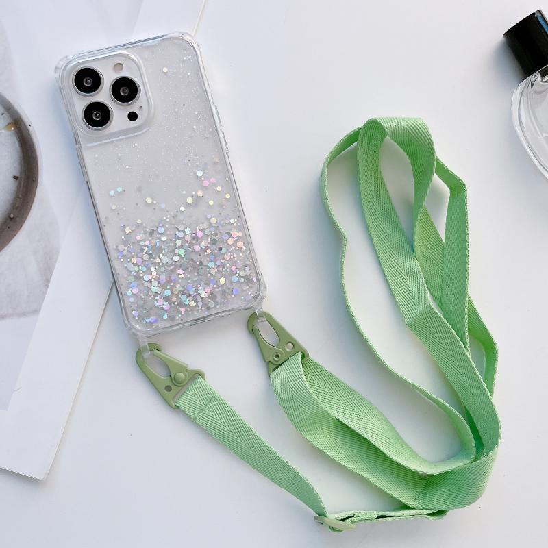 For iPhone 11 Pro Max Lanyard Glitter Epoxy Clear Phone Case (Green)