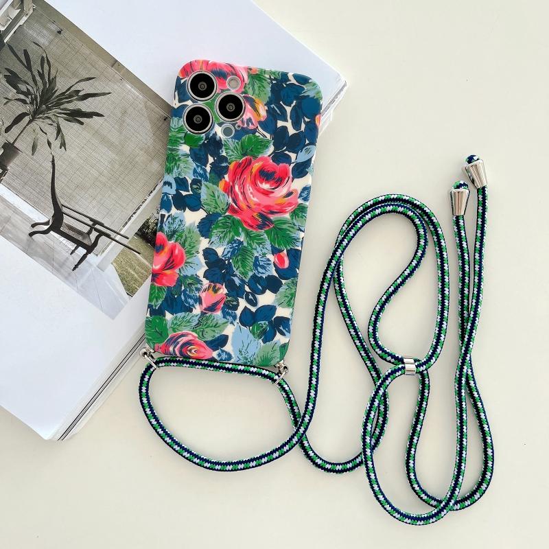 For iPhone 11 Pro Max Lanyard Small Floral TPU Phone Case (Green)
