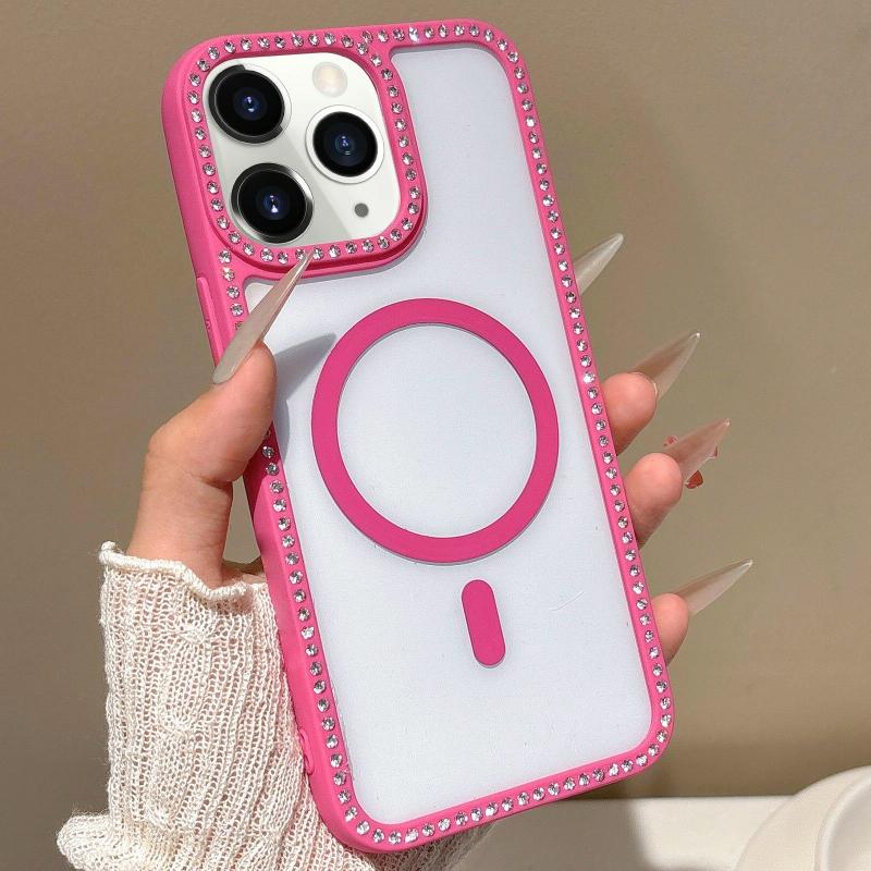 For iPhone 11 Pro Max Large Lens Hole Rhinestone Frame MagSafe Phone Case(Rose Gold)