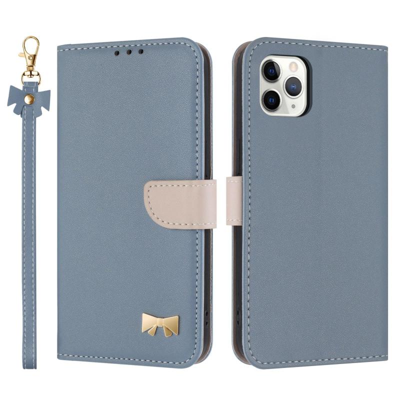 For iPhone 11 Pro Max Metal Bow Leather Phone Case with Hand Strap(Light Blue)