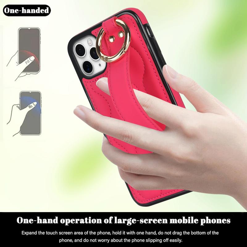 2. The back of the phone case has a freely stretchable band, which is fixed by a solid metal nail and being a kickstand which is good for moving.