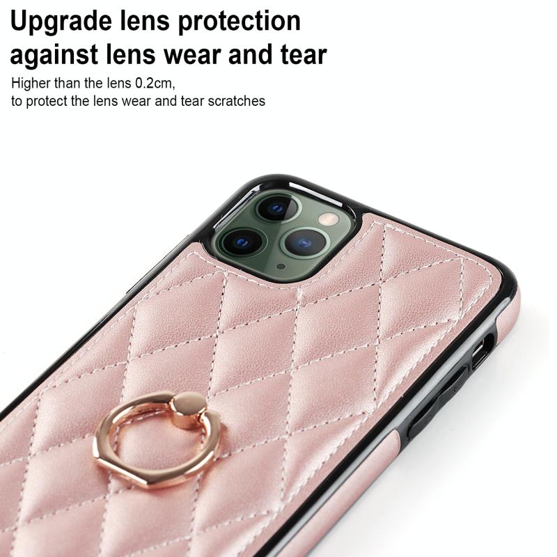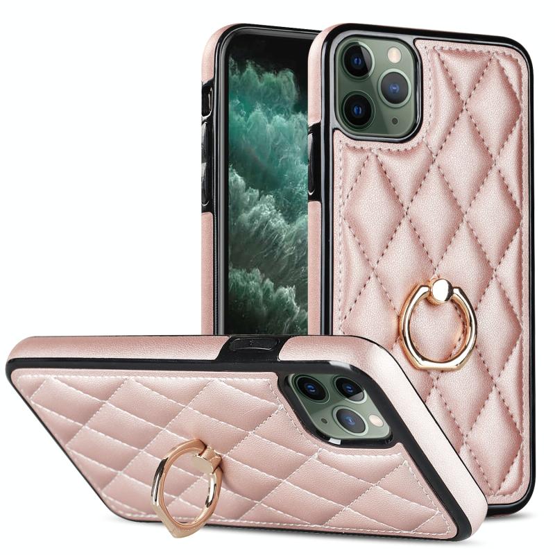For iPhone 11 Pro Max Rhombic PU Leather Phone Case with Ring Holder(Rose Gold)