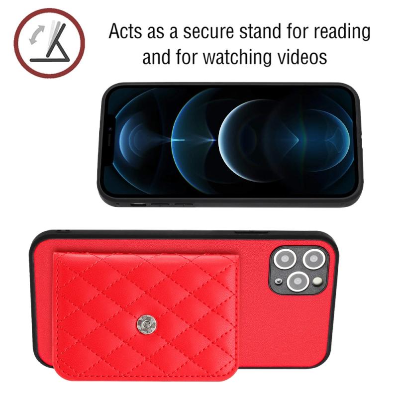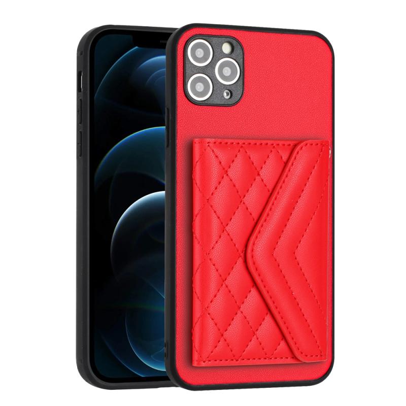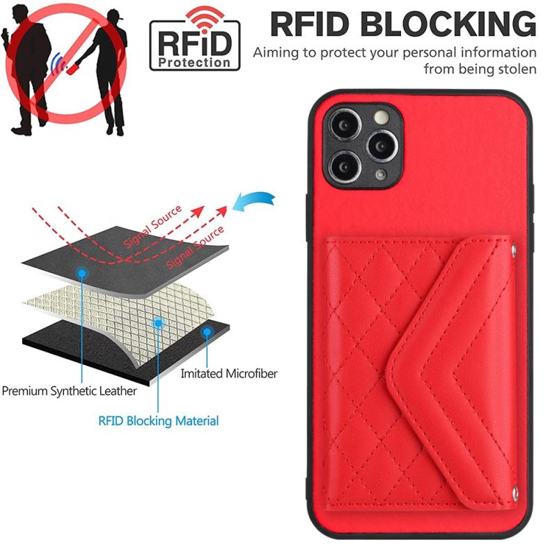 For iPhone 11 Pro Max Rhombic Texture Card Bag RFID Phone Case with Long Lanyard(Red)