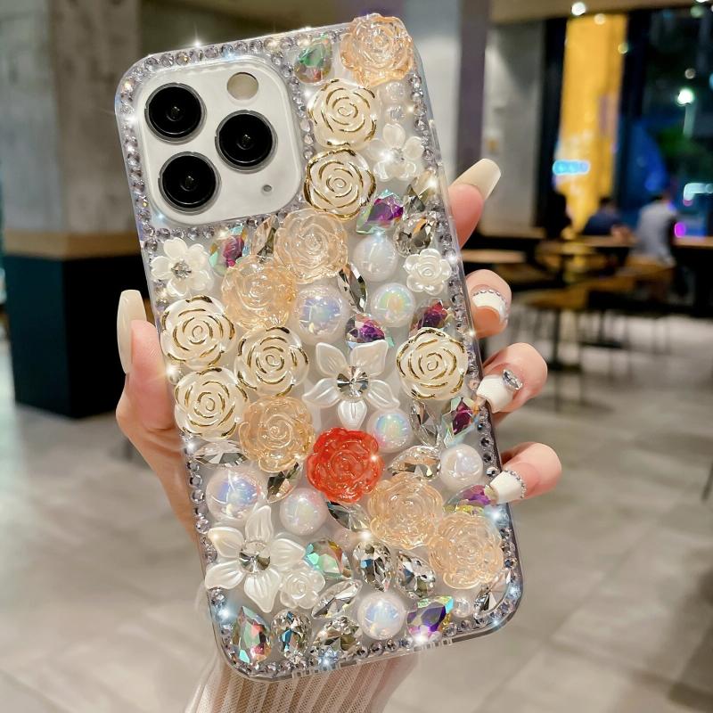 For iPhone 11 Pro Max Rose Hand-set Pearl Diamond PC Phone Case(Apricot)