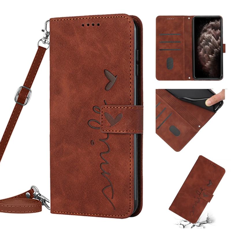 For iPhone 11 Pro Max Skin Feel Heart Pattern Leather Phone Case With Lanyard (Brown)