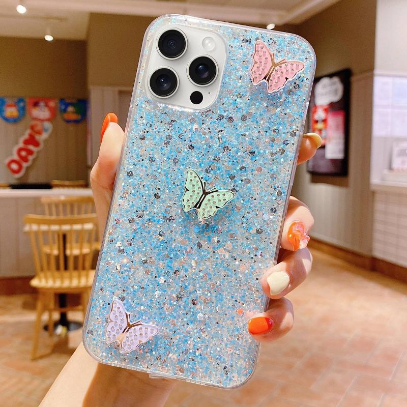 For iPhone 11 Pro Max Starry Sequin Rhinestones Color Butterflies Epoxy TPU Phone Case(Blue)