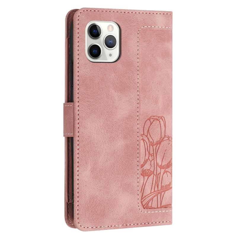 For iPhone 11 Pro Max Tulips Embossed Leather Phone Case with Lanyard(Pink)