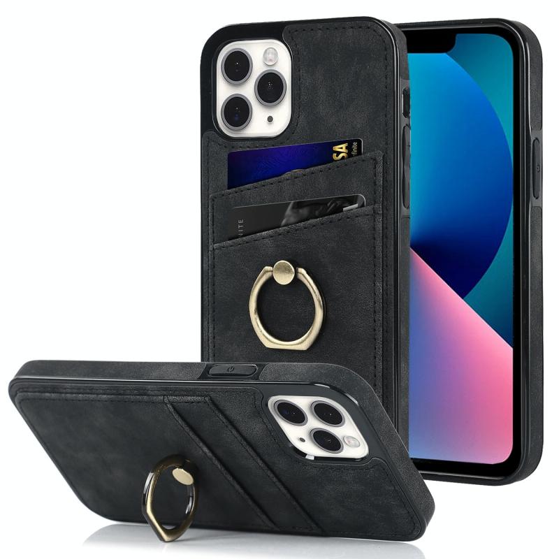 For iPhone 11 Pro Max Vintage Patch Leather Phone Case with Ring Holder (Black)