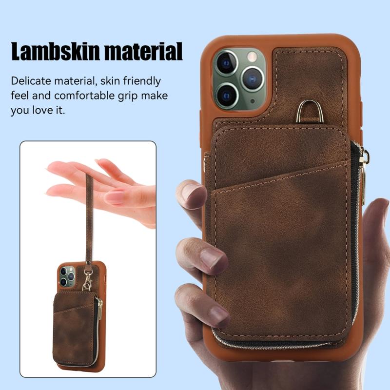 For iPhone 11 Pro Max Zipper Card Bag Back Cover Phone Case(Brown)