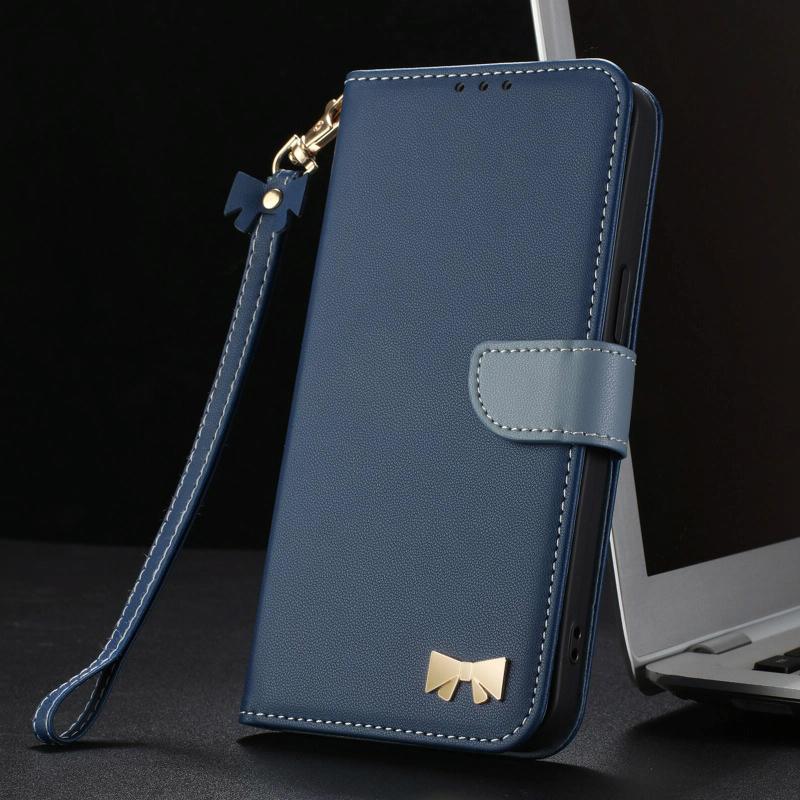 For iPhone 11 Pro Metal Bow Leather Phone Case with Hand Strap(Dark Blue)