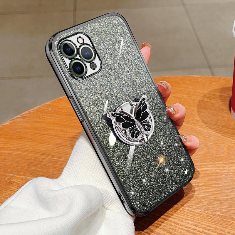 For iPhone 11 Pro Plated Gradient Glitter Butterfly Holder TPU Phone Case(Black)