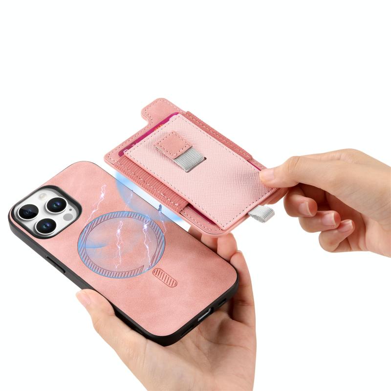 For iPhone 11 Pro Retro Magsafe Cross Leather Pull-Out Card Bag Back Phone Case(Pink)
