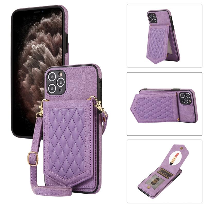 For iPhone 11 Pro Rhombic Texture RFID Phone Case with Lanyard & Mirror(Purple)