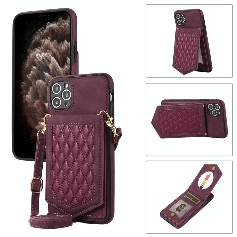 For iPhone 11 Pro Rhombic Texture RFID Phone Case with Lanyard & Mirror(Wine Red)