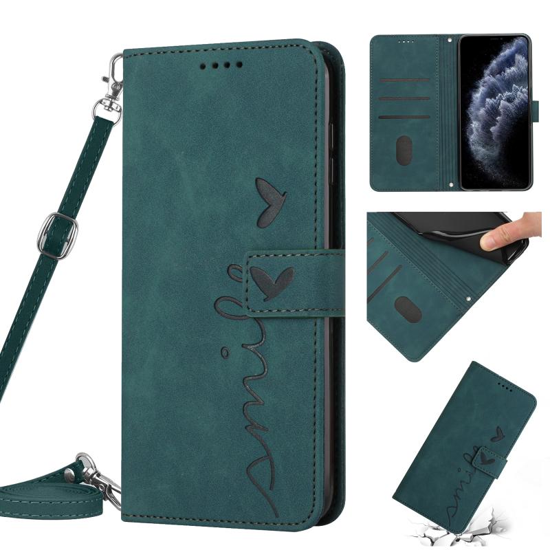 For iPhone 11 Pro Skin Feel Heart Pattern Leather Phone Case With Lanyard (Green)