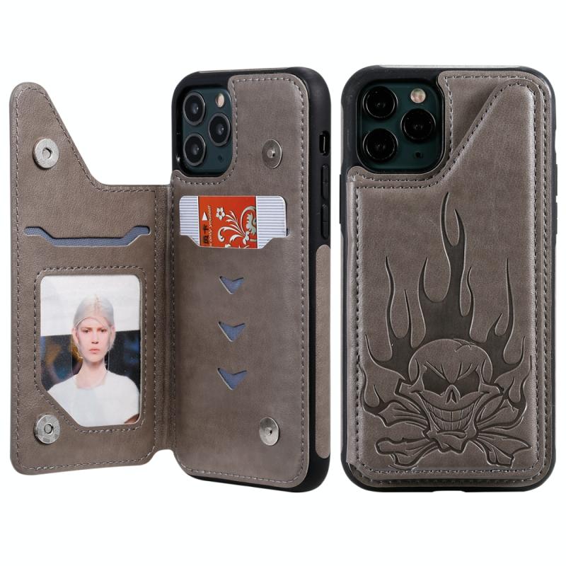 For iPhone 11 Pro Skull Head Embossing Pattern Shockproof Protective Case with Holder & Card Slots & Wallet(Grey)