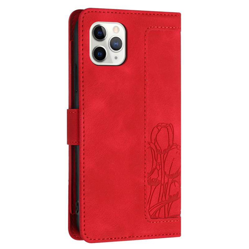For iPhone 11 Pro Tulips Embossed Leather Phone Case with Lanyard(Red)