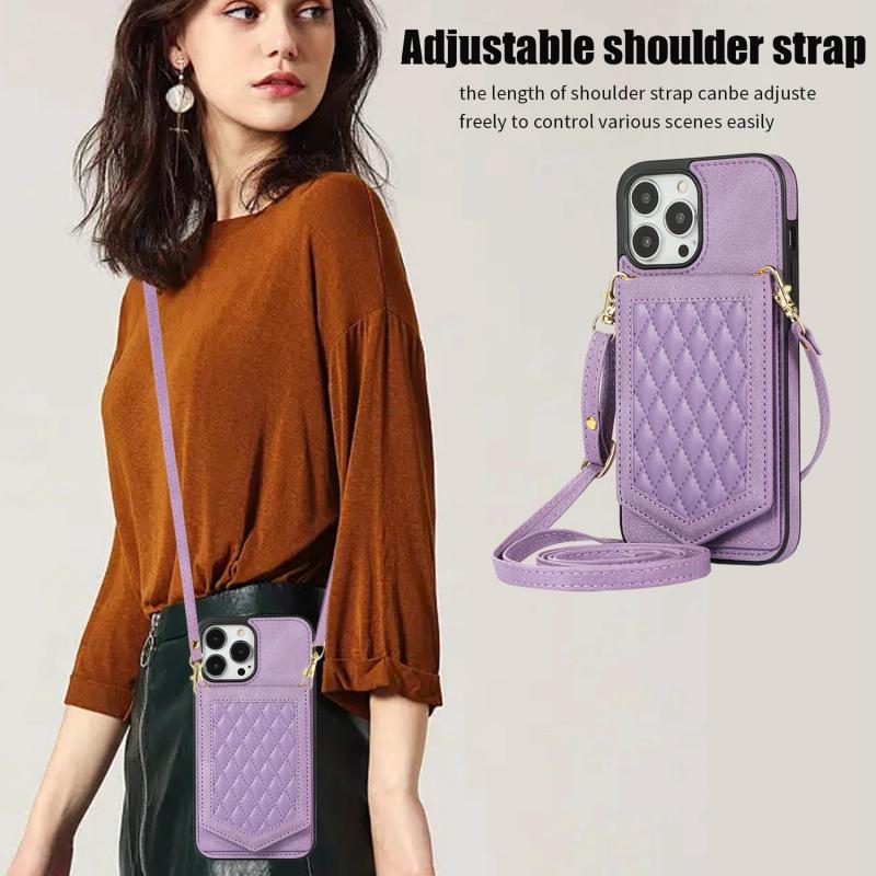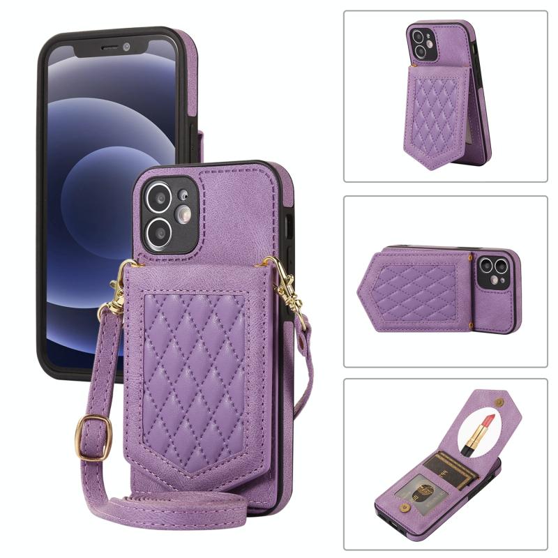 For iPhone 11 Rhombic Texture RFID Phone Case with Lanyard & Mirror(Purple)