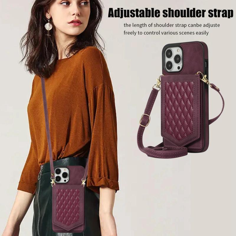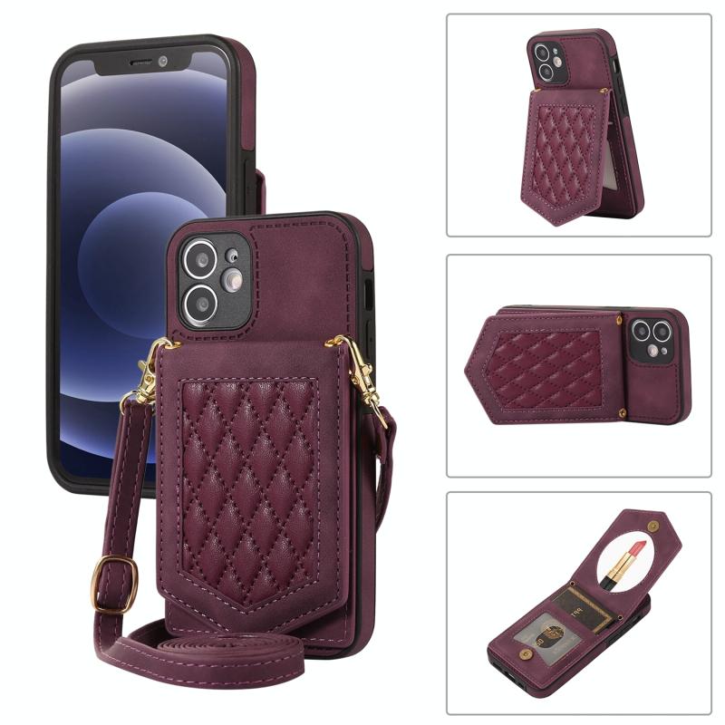 For iPhone 11 Rhombic Texture RFID Phone Case with Lanyard & Mirror(Wine Red)