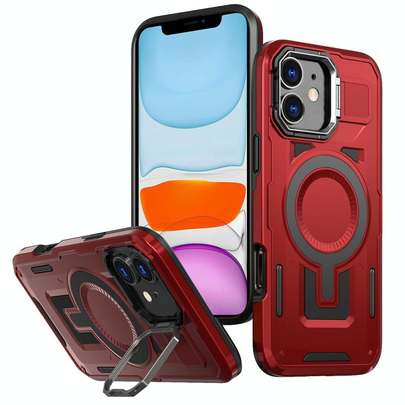 For iPhone 11 Shield Hollow Frame Holder MagSafe Phone Case(Red)