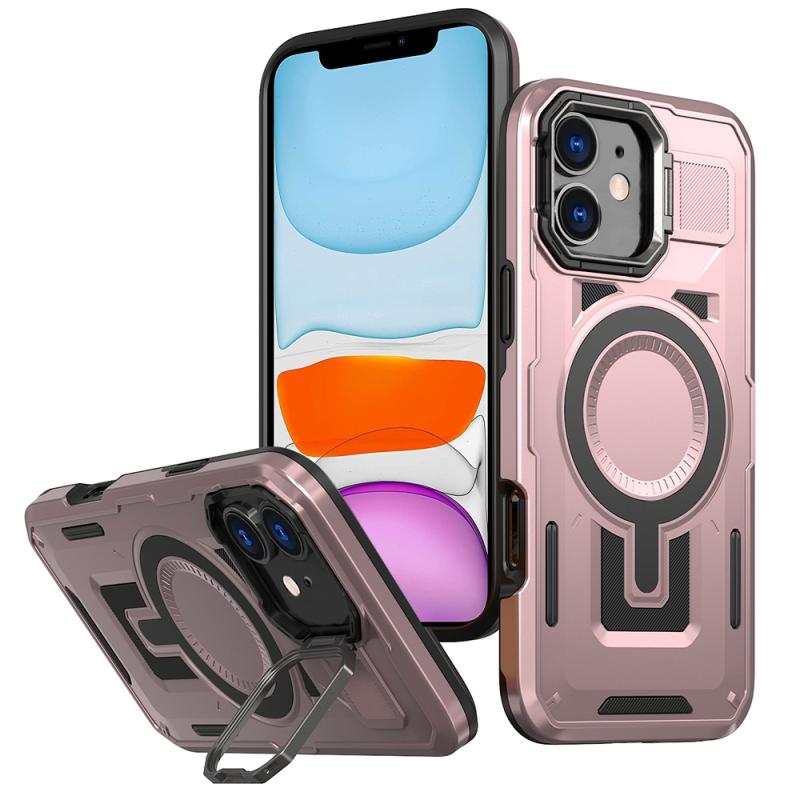 For iPhone 11 Shield Hollow Frame Holder MagSafe Phone Case(Rose Gold)
